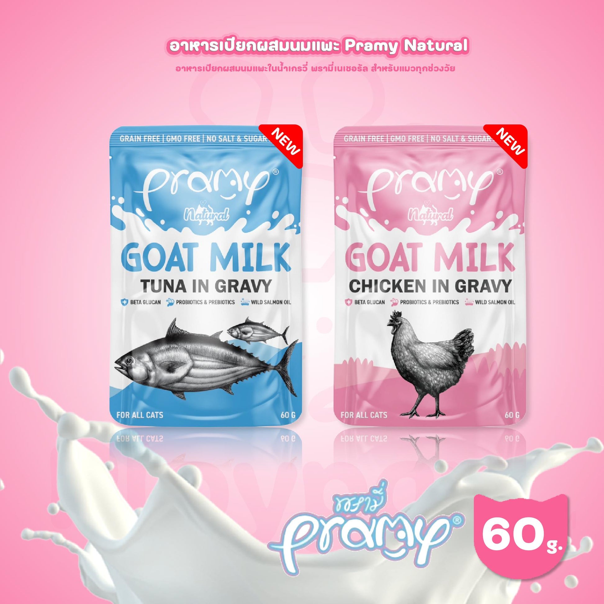 [ปลีก 1 ซอง] Pramy Natural Goat Milk อาหารเปียกแมว ผสมนมแพะ ในน้ำเกรวี่ พรามี่ ขนาดซอง 60 กรัม(g.)
