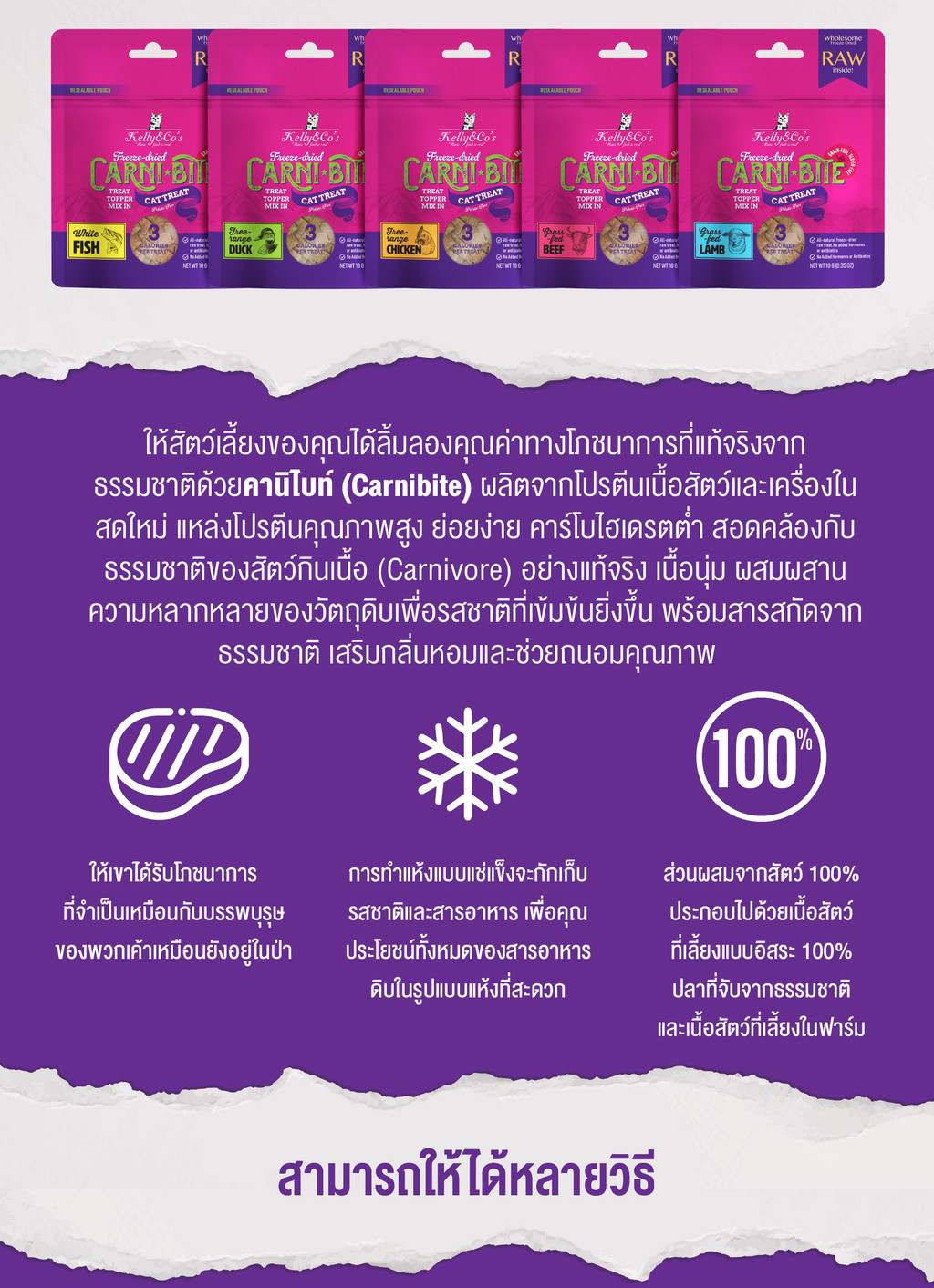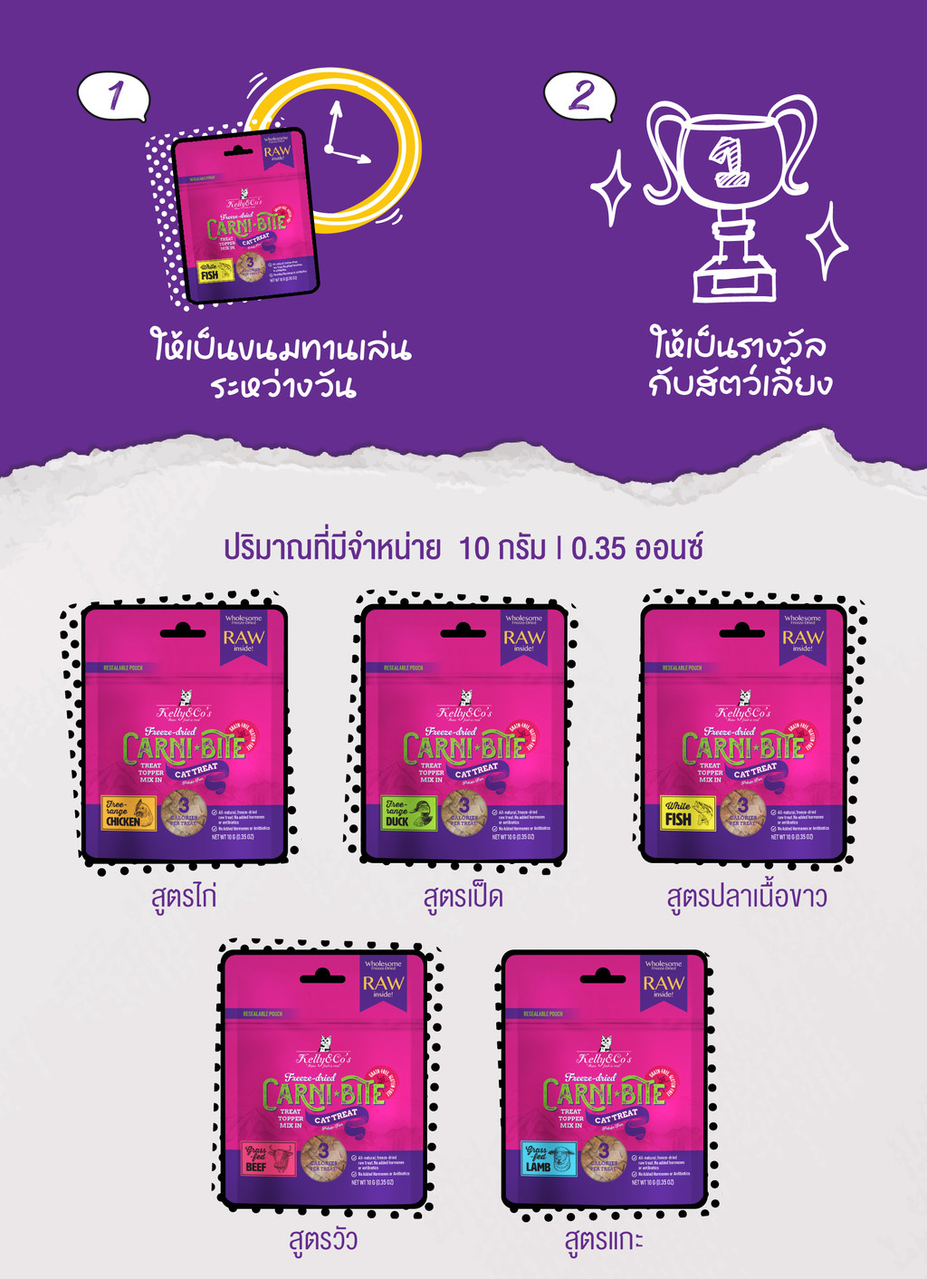 ให้รางวัลนักล่าตัวจิ๋วของคุณด้วย Carni-bite มาจากการรวมคำของ Carnivore (สัตว์ที่กินเนื้อเป็นอาหาร) และ Bite (ขนม) ขนมฟรีซดรายสุดเข้มข้นที่ทำจากเนื้อสัตว์แหล่งเดียว เพราะแมวมีความต้องการตามธรรมชาติในการกินเนื้อสัตว์ มอบรสชาติหอมเย้ายวนเกินห้ามใจในทุกคำ รับรองว่าแมวของคุณจะต้องตื่นเต้นสุดๆ!