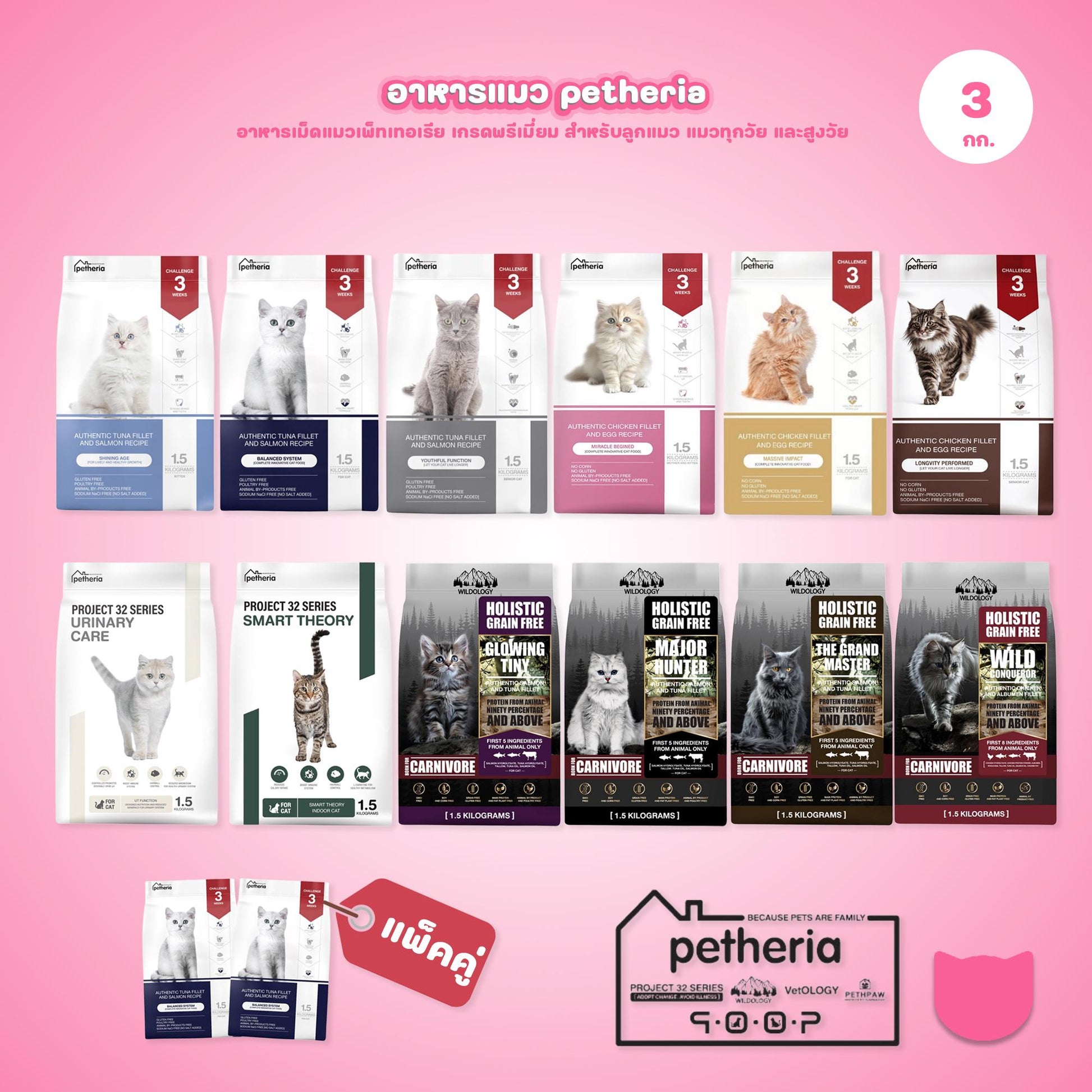 Petheria [แพ็คคู่ 2 ถุง*1.5kg] อาหารแมวเพ็ทเทอเรีย โปรตีนจากปลา บำรุงขนสวย ลูบไม่ติดมือ ขนาด 1.5 กก. 12 สูตร